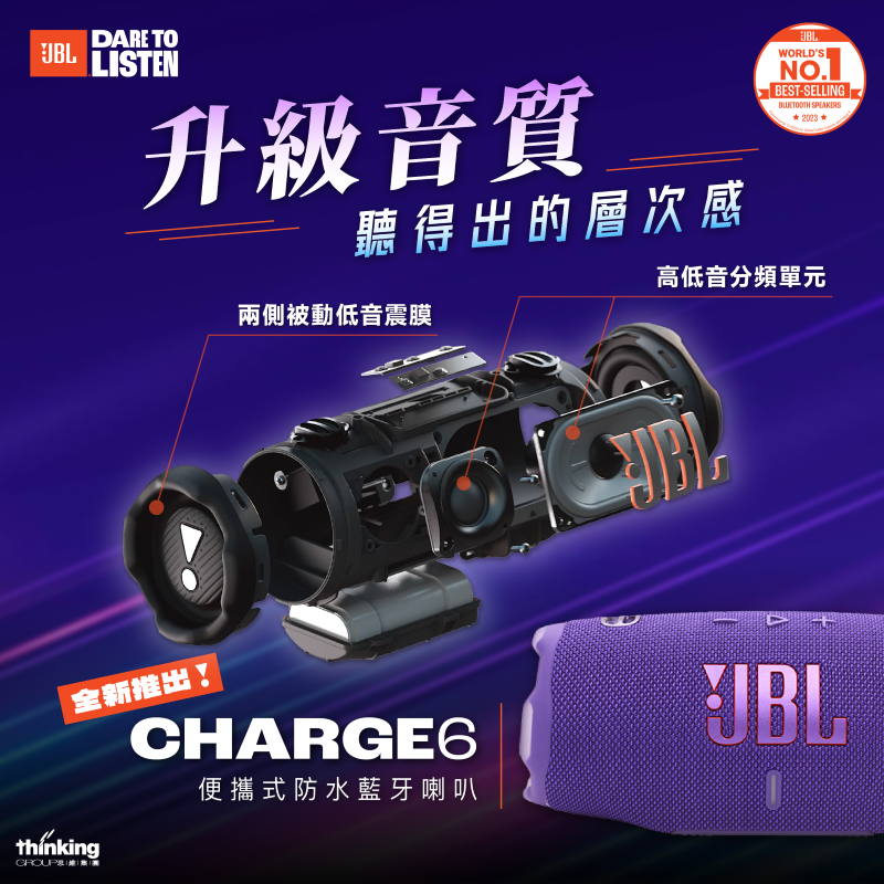 JBL Charge 6 全力出擊,低音更澎湃,高音更通透,層次更豐富,帶來酣暢淋漓的震撼音效!JBL 重新解構頻率曲線,強化低頻下潛深度與高頻延伸解析力,呈現錄音室級別的原音重現。搭載AI Sound Boost 進行動態優化,獨家智能演算法即時分析音源特徵,自動調節聲場平衡。